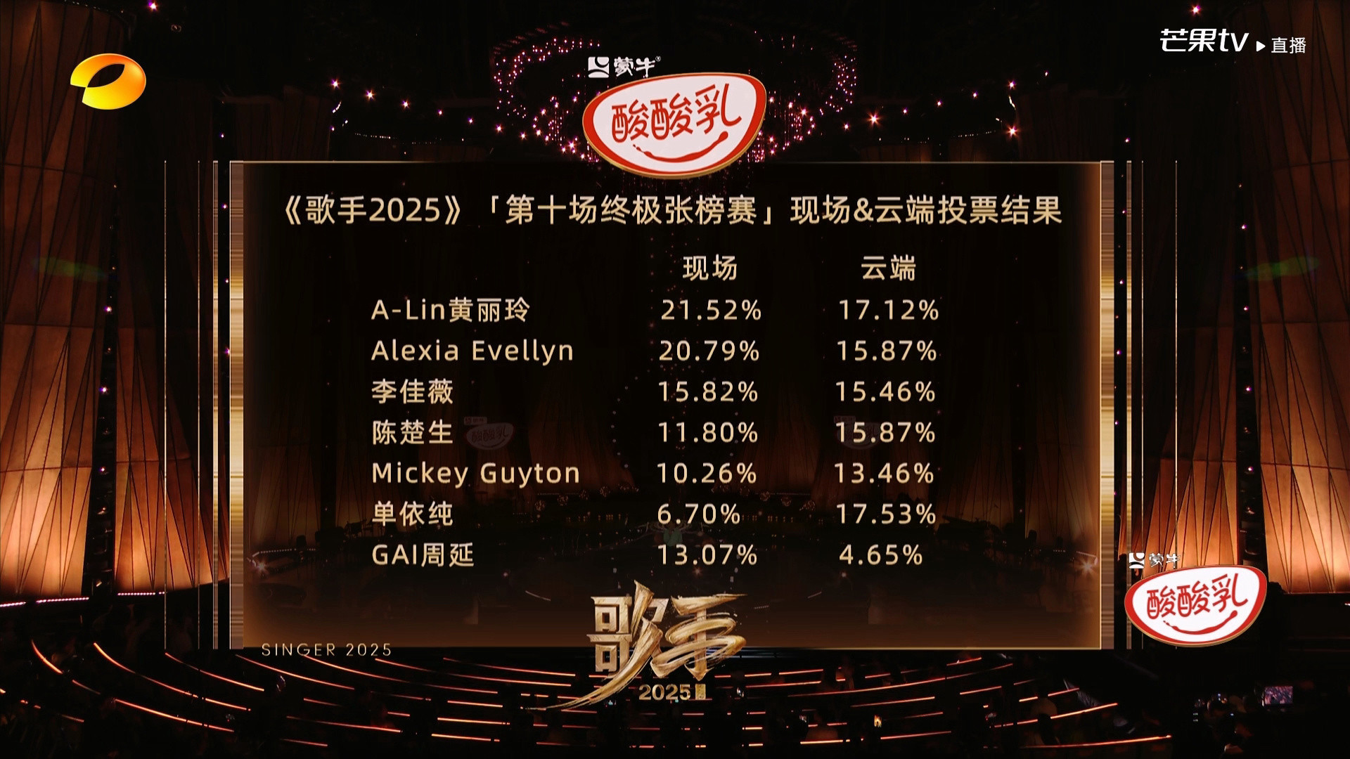 在本期节目中,GAI被淘汰照实让世界没思到,他演唱《故湘,风》后,咱们不错看到,弹幕出现的齐是“第一稳了”,效能现场投票赢得第四名,云表投票倒数第一,两个相加之后,GAI排行倒数第一。